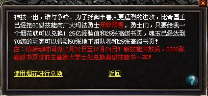 本次活动时间有限,为限时开放!等待60级新技能更新后,玩家凭5000张高级书页可前去皇家大学士处兑换高级技能书一本!