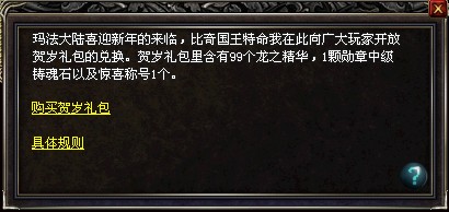 活动期间,我们为您精挑细选多款心水好礼,价值5888元宝的贺岁礼包,现在4999元宝就开抢了,数量有限,先到先抢,抢完即止,其中包含:包含99个龙之精华、驰骋玛法的称号(攻击+12,魔法+12,道术+12,刺术+6,箭术+12,称号持续时间15天),和一枚勋章中级铸魂石!