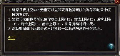 注:活动期间每个玩家最多只能换取一次驰骋玛法称号的机会。礼包数量有限,只能购买1次