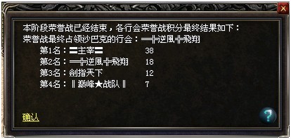 以下为国际公测11区1月6日—1月20日首阶段沙巴克荣誉战战果揭晓。