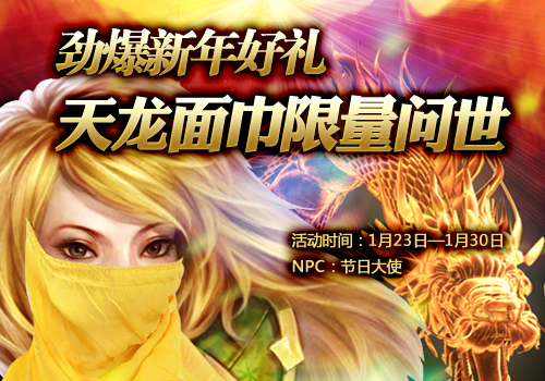 新年好礼来袭,除了天龙面巾之外,还有大量经验、方巾、灵符礼包、强身秘方(绑定)、一马当先尊贵称号、高级面巾铸魂石等好礼等你来!