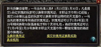 1月23日至1月30日,凡是提交1朵红玫瑰的玩家都可以换取玫瑰凭证,相应职业的方巾和1亿经验(魂玉70级的玩家可以换取玫瑰凭证,相应职业的方巾和50张限时灵符)
