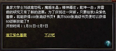 在即将到来的新春之际,为了抵御怪兽军团的再次反扑,皇家大学士对战意怒吼,魔盾冰晶,精神灌注,乾坤一击,奔雷箭的研究又有了新的进展。为了庆祝这一突破,并提升广大勇士们的实力,现在开始,只要在新春期间,赠送庄园节日大使1朵紫色蔷薇表示感谢,就能获得100张高级书页!集齐5000张高级书页便可以获得60级新技能了!