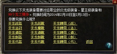 使用对应炎龙级装备、星王级装备和99个龙之精华,即可兑换天龙系列头盔、靴子、腰带