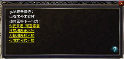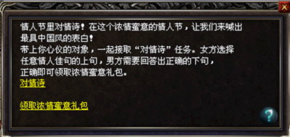 身无彩凤双飞翼,心有灵犀一点通!想看看你们之间是否真的有缘分吗?不如携手来节日大使处参加对情人节对诗活动,看你能够猜透她的心意?!情人节来临之际,男女玩家可以两两组队前往NPC节日大使处对诗。先由女方选择一首情诗的上句,选择完毕之后,由男方作答。如果男方顺利对上情诗,说明你们心有灵犀,节日大使不仅为你们送上祝福,还会送上情人节浪漫大礼哦!