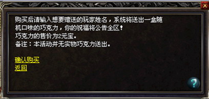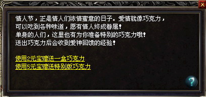 花2元宝购买一盒巧克力送给心上人,你将获得200万经验奖励