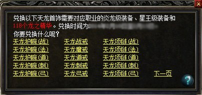 使用对应炎龙级装备、星王级装备和118个龙之精华,即可兑换天龙系列护腕、戒指、项链