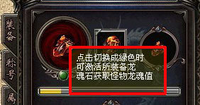如何激活龙魂石?龙魂石的装备栏正下方处有一个圆形的激活切换按钮,当按钮切换至绿色时说明该龙魂槽已被激活,可以通过消灭特定怪物获取龙魂值,当按钮显示红色时,可以单击按钮切换成绿色。