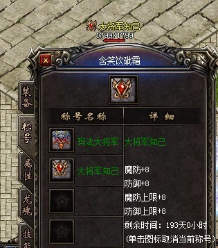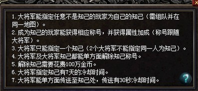 这位知己将拥有“大将军知己”的荣耀称号,称号时效跟随玛法大将军。