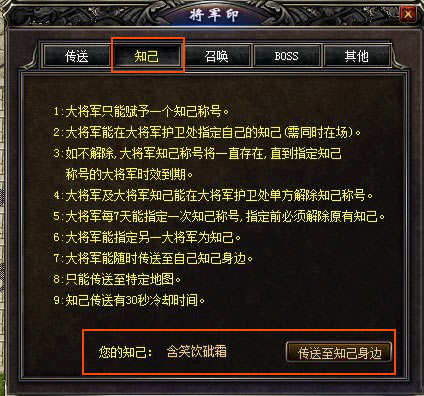 大将军能随时传送至知己身边,玩家在包裹中、或人物装备栏中打开将军印,