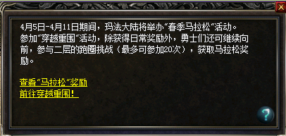4月5日—4月11日,玛法大陆又将举办“春季马拉松”活动。赶快来参加“穿越重围之春季马拉松”活动,除了日常奖励之外,更可继续向前,参与二层的跑圈挑战,获取大礼哦!