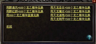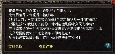 若你能带来一件天龙圣衣/天龙魔衣/天龙道袍/天龙刺甲,那么只需要给节日大使588个龙之精华,即可任选!