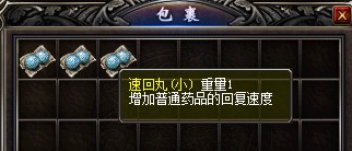 速回丸:能提升金创药(小量)、金创药(中量)、强效金创药的回复速度。由某些怪物爆出。速回丸提供的BUFF能持续大约半小时左右。死亡或小退后,速回丸效果不会消失。