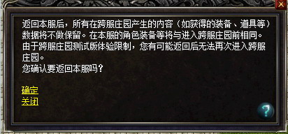 玩家在跨服庄园找到NPC:跨服庄园大使,即能返回本服!但是所有在跨服庄园产生的内容(如获得的装备、道具等)数据将不做保留。在本服的角色装备等将与进入跨服庄园前相同。