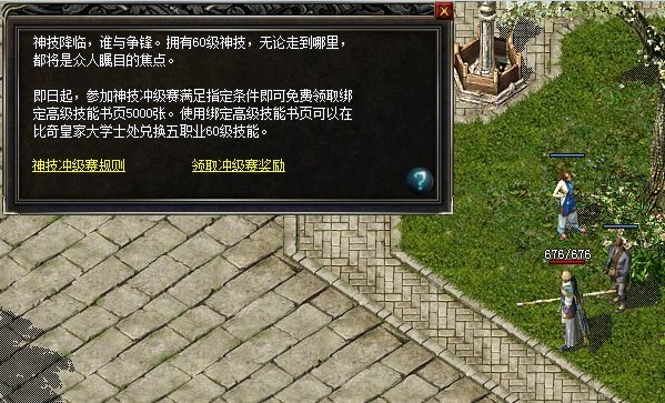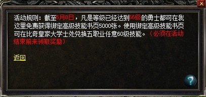 神技降临,谁与争锋!拥有60级神技,无论走到哪里,都将是众人的焦点!即日起,参加神技冲级赛,截止6月8日,凡是等级已经到达66级的玩家都可以在节日大使处免费获得绑定高级技能书页5000张!使用绑定高级技能书页可在比奇皇家大学士处兑换5职业任意60级技能!(必须在活动结束前来领取奖励)!