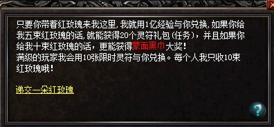 递交5朵红玫瑰,除了每朵获得的经验外,还能额外获得20个灵符礼包(任务)