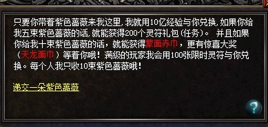 递交5朵紫色蔷薇,除了每朵获得的经验外,还能额外获得200个灵符礼包(任务)