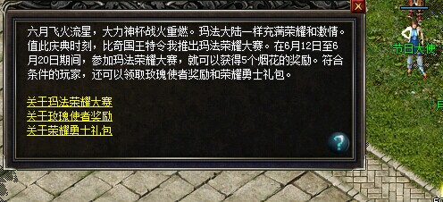 玛法大陆一样充满荣耀和激情。值此庆典时刻,比奇国王特令我推出玛法荣耀大赛。在6月12日至6月20日期间,参加玛法荣耀大赛,就可以获得5个烟花的奖励。符合条件的玩家,还可以领取玫瑰使者奖励和荣耀勇士礼包。