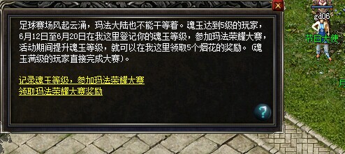 魂玉达到5级的玩家,6月12日至6月20日在我这里登记你的魂玉等级,参加玛法荣耀大赛,活动期间提升魂玉等级,就可以在我这里领取5个烟花的奖励。(魂玉满级的玩家直接完成大赛)