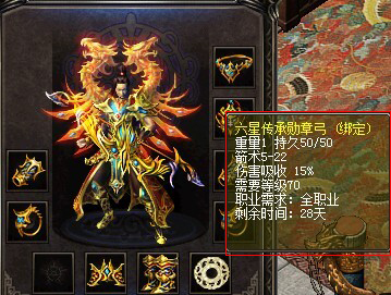 六星传承勋章道:道术5-22,重量1,持久50/50,伤害吸收15%,需要等级70。