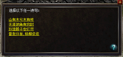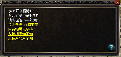 身无彩凤双飞翼,心有灵犀一点通!想看看你们之间是否真的有缘分吗?不如携手来节日大使处参加对诗活动,看你能够猜透她的心意?!七夕来临之际,男女玩家可以两两组队前往NPC节日大使处对诗。先由女方选择一首情诗的上句,选择完毕之后,由男方作答。如果男方顺利对上情诗,说明你们心有灵犀,节日不仅为你们送上祝福,还会送上七夕浪漫大礼哦!