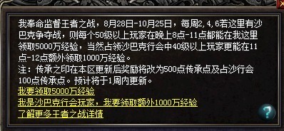 白金联赛期间所有参与的50级以上玩家都能在沙巴克军需官(660,306)处领取大量经验奖励。当天占领沙巴克的行会玩家更能额外经验奖励。