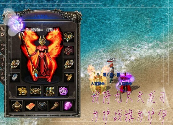 国际1区〓戰旗飄飄〓从热血走到归来,从归来7区到国际1区,永远是叱咤在玛法风云里的骄子,他们共同守护着这一旗号,玛法沙城,夺宝战场,无论对手如何强大,从未胆怯过,玛法史册里辉煌一时的行会不计其数,沙巴克上空飘扬的旗帜经常易主,但是战旗人的信念只有一句:哪怕血染黄沙战旗飘飘不永不倒!