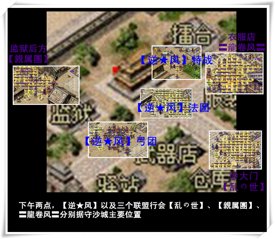 如图所示,【逆★风】的联盟行会〓龍卷风〓镇守衣服口上方,【親属團】雄踞垃圾口和监狱的后方,【乱の世】行会牢牢守住沙巴克大门,门里门外都是水泄不通。【逆★风】行会的法团占据沙巴克复活点和皇宫楼梯口,弓团在监狱前方,特战在擂台左侧,沙巴克城满城都是蓝色和紫色。