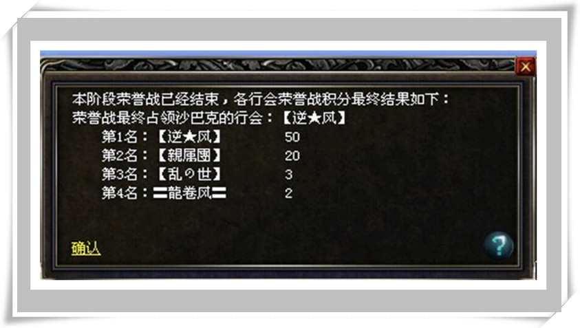 直到首轮沙巴克战争结束,【逆★风】一直保持着积分遥遥领先的局面,最终,【逆★风】拿到50分,联盟行会【親属團】20分,【乱の世】3分,〓龍卷风〓2分。