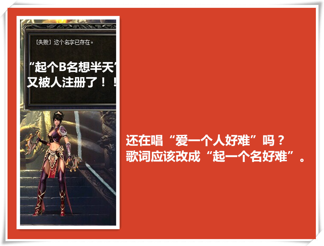 “我不想叫这个名字了”叫什么名字好呢?“我要起个唯美的……”“我要起个霸气的。”想来想去,最后叫个“起个B名想半天”,即便是这样,当你确定的时候竟然提示你:失败!这个名字已存在。