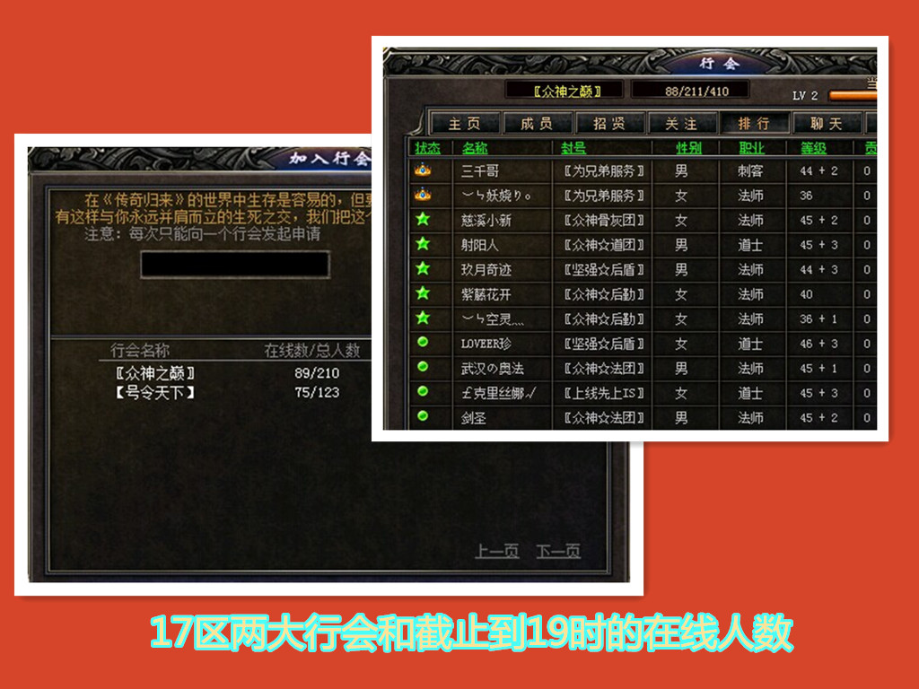 本区第一建立行会是号令天下,但是人数最多的是第二个建会的〖众神之巅〗,由于号令天下唯一在线的掌门一直在忙,没有直接采访到。〖众神之巅〗掌门位置的是美女︶ㄣ妖娆りo 她是从16区来,行会的老大和指挥是15区过来玩的,指挥三千哥说,他们和现在的号令天下在15区就是敌对,一直在打。刚刚的夺宝战也打得很凶,虽然现在人不多,但是我觉得会火的。︶ㄣ妖娆りo也调皮地说,17区现在人少,我们就是来拯救17区的。