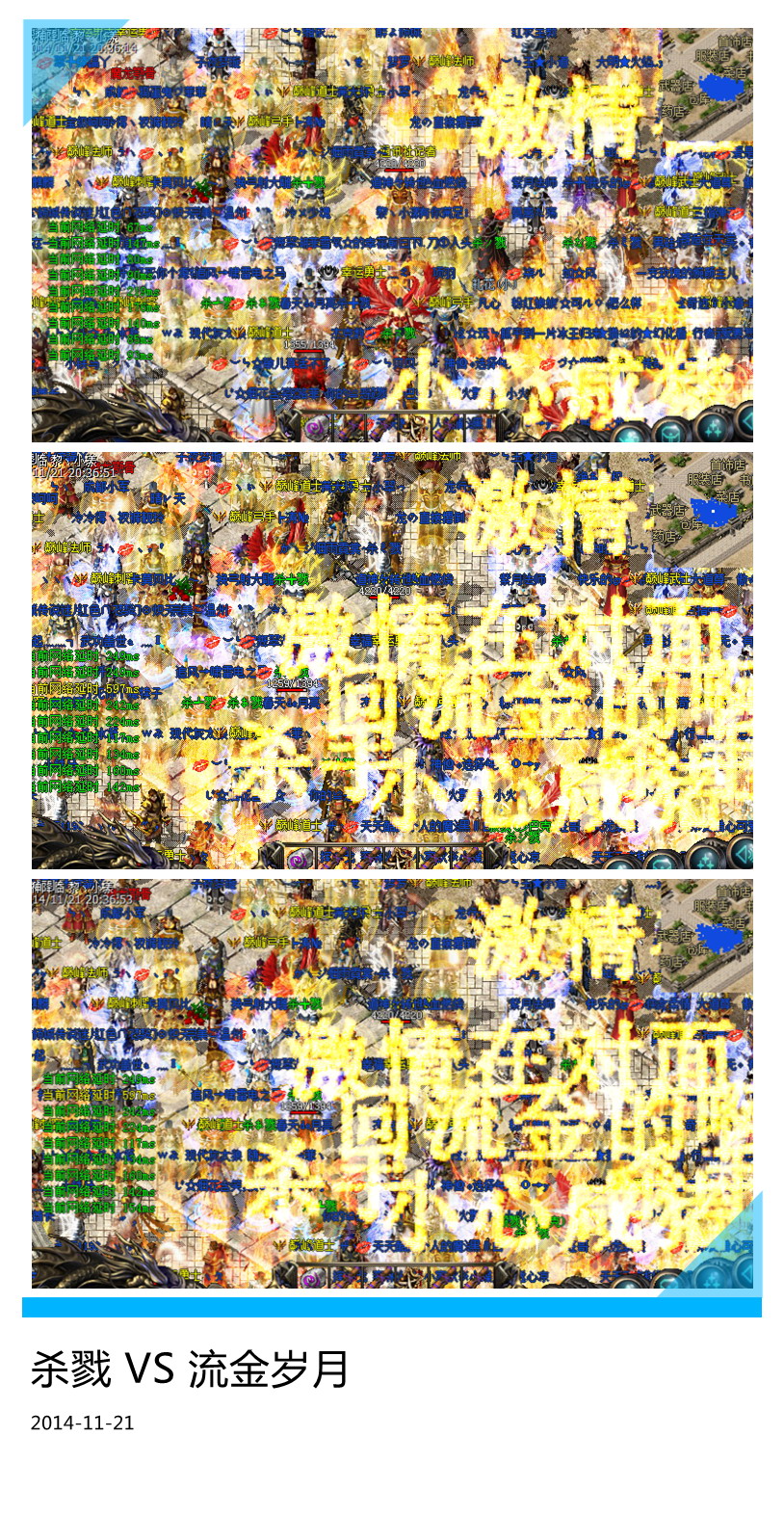 2014/11/21,杀戮Vs流金岁月第一场淘汰赛如期举行,记者小漾从6点开始进服,一直跟随到最后,见证了一场激烈的生死搏杀,同时见证了一场难得的兄弟情义。