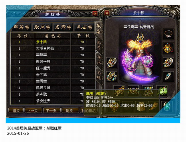 杀戮红军,传奇归来中第一个达到魂玉180级巅峰的玩家,也让大家率先大开眼界,见识下顶级魂玉是长什么模样。而攻击68刺数68的高主攻属性,再加上红军大将军封印、护国大将军军衔、七星传家宝、30级传承的顶配装置,让他在战场上飞沙驰骋毫无阻碍。(根据小编目测,其恐怖指数达到满星,在此手动给32个赞。)