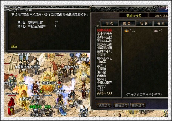 新春荣誉战在春节过后打响,归来1.3···26区(607区) 豪城※世家 行会联合其他小会,团结一心,朝着沙巴克城出发。团结的利剑,众志成城的决心将 豪城※世家的旗帜插遍了整个沙巴克旗点, 豪城※世家的旗号在沙巴克上空迎风飘扬。