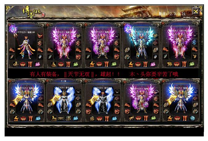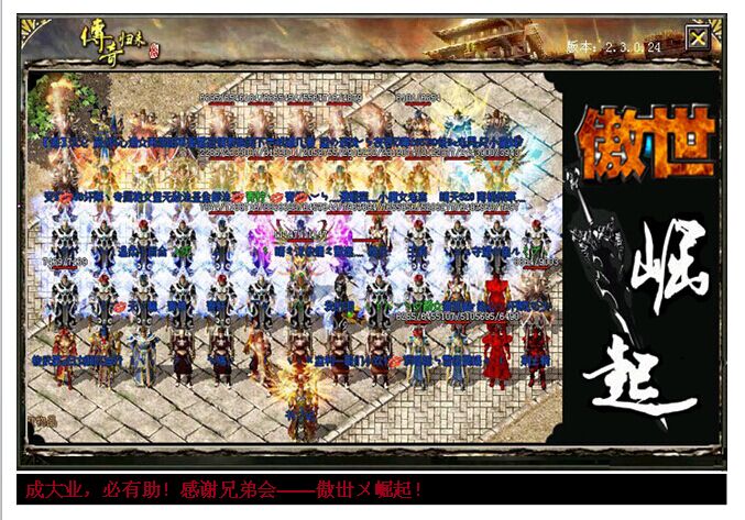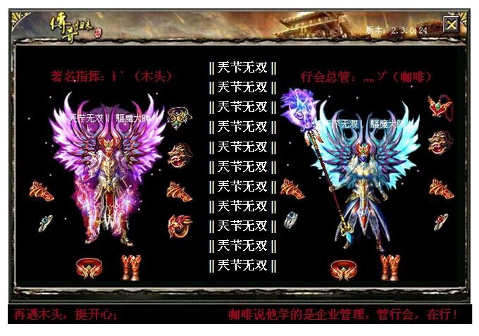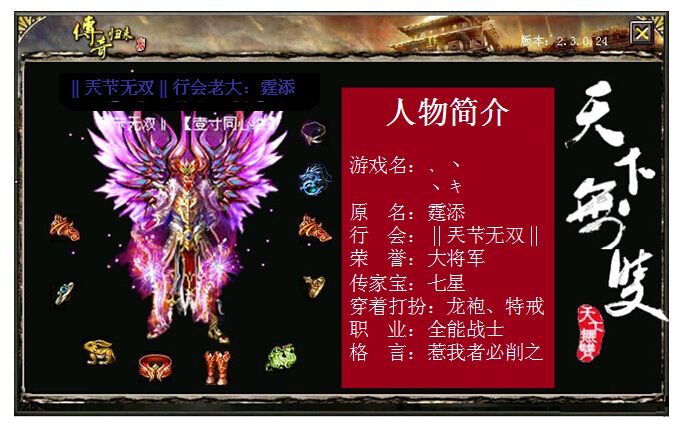 ‖兲芐无双‖的老大霆添始终是行会的灵魂,在兄弟们的建议下,决定再次来一把弱对强的逆袭。站出来独挡一面,不只是让行会兄弟能玩得痛快些,更是为全区的草根谋取真正的福利。霆添老大如今已经不再被称为“麻痹哥”,“书记”是大家对他的亲切称呼,书记付出了很多,时间、精力、物力、财力,行会成员很快装备、整体实力都上来了,龙啸装备、特戒号就有20多个,大家也都渐渐的“帅”了起来。