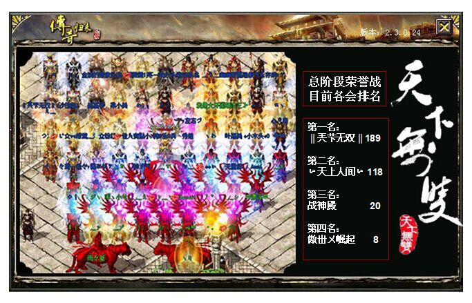 占领沙巴克,那是实力的象征!‖兲芐无双‖自然也想证明一下。敌对有ぃ天上人间ぃ和≡同生共死≡两会联盟,‖兲芐无双‖也与傲丗ㄨ崛起结成战略合作伙伴,一二阶段已经错过了,三阶段重新来过吧!四个行会两两联盟在大家的共同努力下,接连拿下了三阶段和四阶段的沙城,行会上下人心振奋,有强大的行会做后盾,弟兄们出去玩也踏实多了。