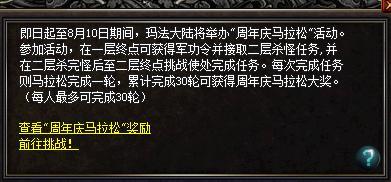 8月5日至8月10日期间,玛法大陆将举办“周年庆马拉松”活动。参加活动,每次到达挑战一层终点可获得奖励并接取二层杀怪任务,并在二层杀完怪后至二层终点挑战使者处完成任务。每次完成任务则马拉松完成一轮,累计完成30轮可获得周年庆马拉松大奖。(每人最多可完成30轮)