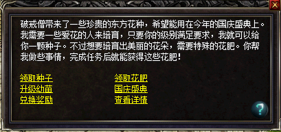 破戒僧带来了一些珍贵的东方花种,希望能用在今年的国庆盛典上。节日大使需要一些爱花的人来培育,只要你的级别满足要求,节日大使就可以给你一颗种子。