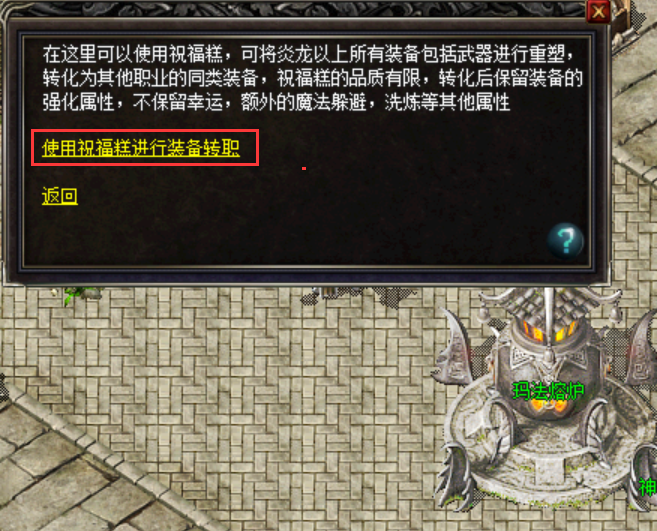 使用方法:前往庄园玛法熔炉,使用祝福糕的灵力即可将炎龙及以上装备转换为其他职业装备。