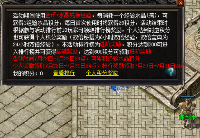 活动内容:7.22-7.28日24点(服务器重启后开启),在炼金师处参与金币+水晶兑换经验,将获得经验水晶积分,每日第一次参与获得26分,其余无论消耗多少金币,每次兑换都获得1积分,活动积分可在经验水晶积分榜中查询。