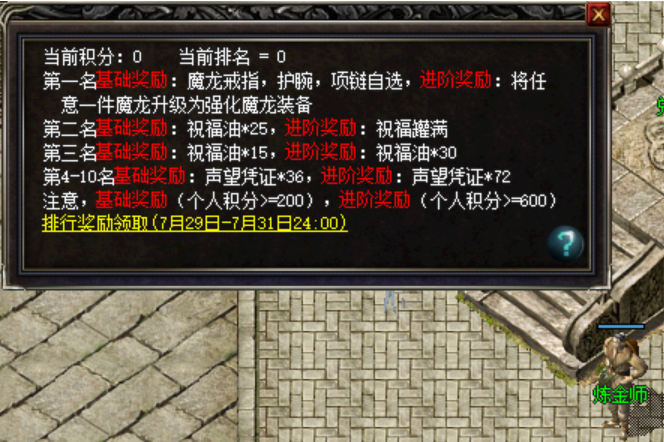 活动结束后,7.29日---7.31日,服务器根据活动排行榜,可领取1-10名的服务器排行奖励,200积分以上领取普通排行奖励,600积分以上可升级为进阶奖励(奖励只可领取一档)