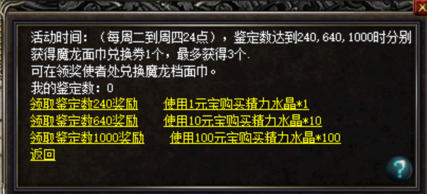 - 每周五特别奖励:每次鉴定有1%的概率获得1级宝石(生命石,红药石,魔防石,暴击石)