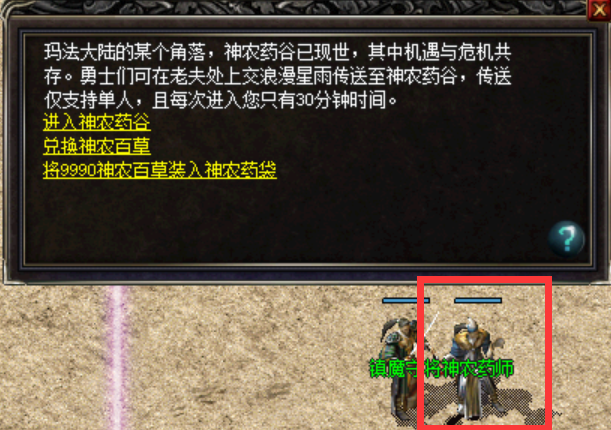 神农药师位于盟重坐标(325,338)使用浪漫星雨可以进入神农药谷收集神农百草(拾取绑定)拾取绑定