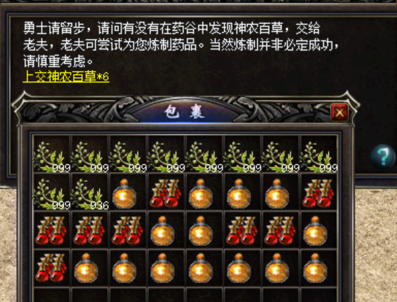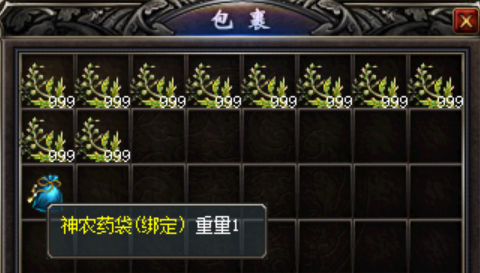 神农草太多可以通过神农药师兑换成神农药袋,方便存入仓库,双击神农药袋解包9990个神农药草