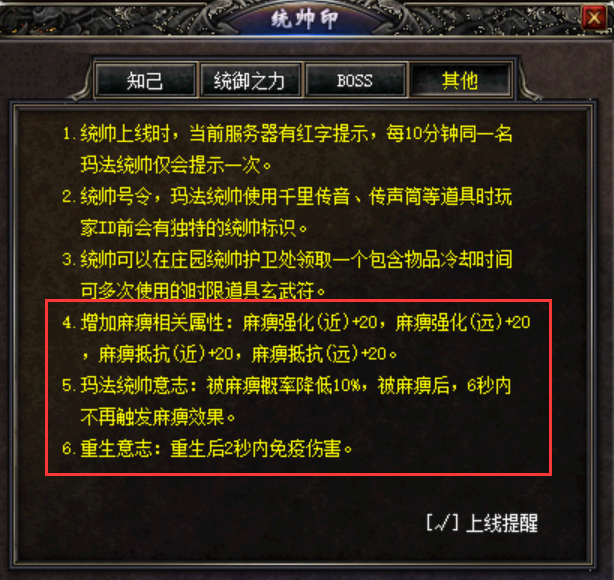 统帅上线时,当前服务器有红字提示。每10分钟同一名玛法统帅仅会提示一次。