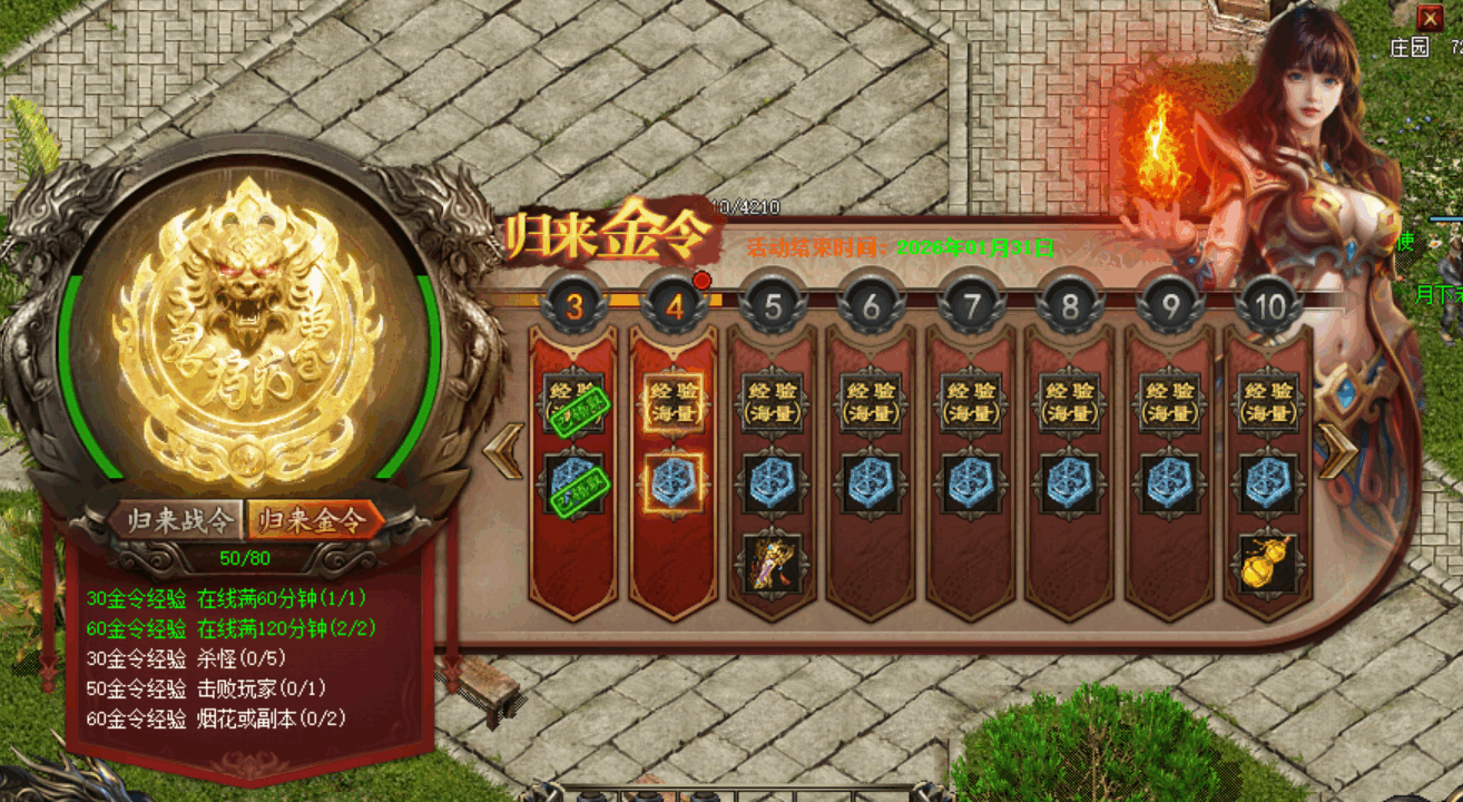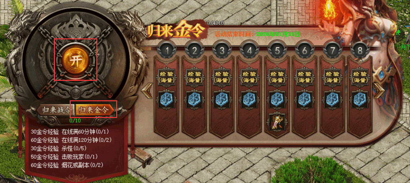 3. 归来战令为免费奖励,金令为付费奖励,金令每次购买需要288传奇币。