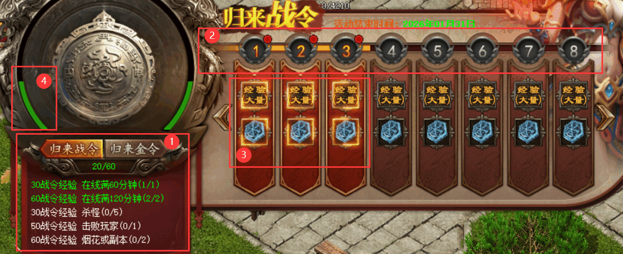 标示1:战令任务显示区,完成任务(在线时间,击杀怪物,击败玩家,战灵,烟花,藏宝秘境(个人),图鉴副本等)可获得战令经验值。