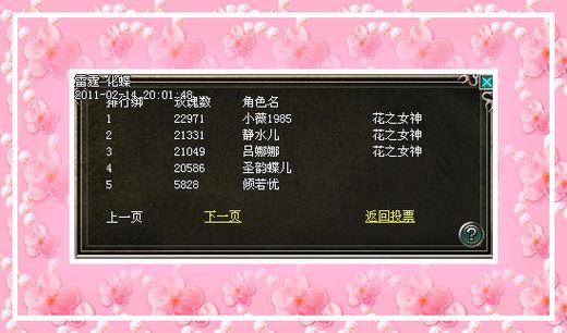 随着情人节的到来,花之女神”活动基本接近尾声,究竟花落谁手?下午18点将揭开谜底。下午14点“花之女神”排行榜,名列第一的是〓英雄城〓的小薇1985 玫瑰:22519第二:誓★言的静水儿玫瑰:19399 第三:〓九龍堂〓的圣韵蝶儿玫瑰:16623 而位居第四的友情‖9527‖吕娜娜紧随其后,玫瑰:14556与圣韵蝶儿相差2067。
